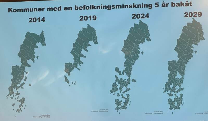2014 såg man en minskning i större delen av Sverige även om den var störst i norra Sverige. I Nybro gick vi stadigt nedåt och låg som lägst på ca. 19400 invånare. En förändring skedde dock efter flyktingvågen vilket syns på bilden från 2019. I Nybro växte vi snabbt och kraftigt med ca. 1000 invånare på mindre än 3 år och 2017 hade vi ca 20400 invånare och det föddes mer än 250 barn. Men som ni ser på bilden för 2024 kom vändningen snabbt och täcker nu stora delar av Sverige igen. När vi går in i 2026 så har Nybro minskat i befolkning kraftigt från 2017 och är nu nere på ca 19.800 och det föddes 2025 rekordfå barn i Nybro, under 150st. En titt på 2029 så förstår ni åt vilket håll vi fortsätter att gå. Risken är stor att vi kommer hamna under de 19400 vi hade 2014.