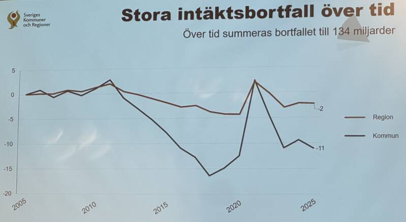 Samtidigt ser vi på dessa bilder hur stödet från staten minskar. Den första bilden visar generella statsbidrag där den mörka linjen är till kommuner. Vi ser en topp under pandemin som sen efter 2022 störtdyker. Generella statsbidrag är stöd från staten som vi kan använda till de delar där vi behöver dem mest utan krav på återrapporter. Dessa är inte inflationssäkrade så samtidigt som inflationen rusade har alltså bidragen fortsatt sjunka samtidigt som varje krona har blivit mindre värd. Så med detta sagt så förlorar vi inte bara intäkter på skattemedel utan också stöden från staten.