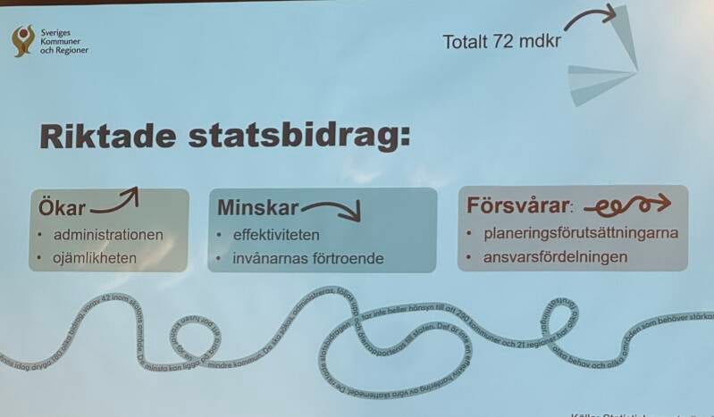 För varje riktat stöd måste sökas, dokumenteras hur stödet används för att se återrapporteras. Det betyder att en stor del av riktade statsstöd också innebär ökade kostnader för uppbyggnad av verksamhet. Det är alltså exakt som bilden beskriver, det ökar ojämlikheten mellan förvaltningar, det minskar effektiviteten och försvårar planeringsförutsättningarna.